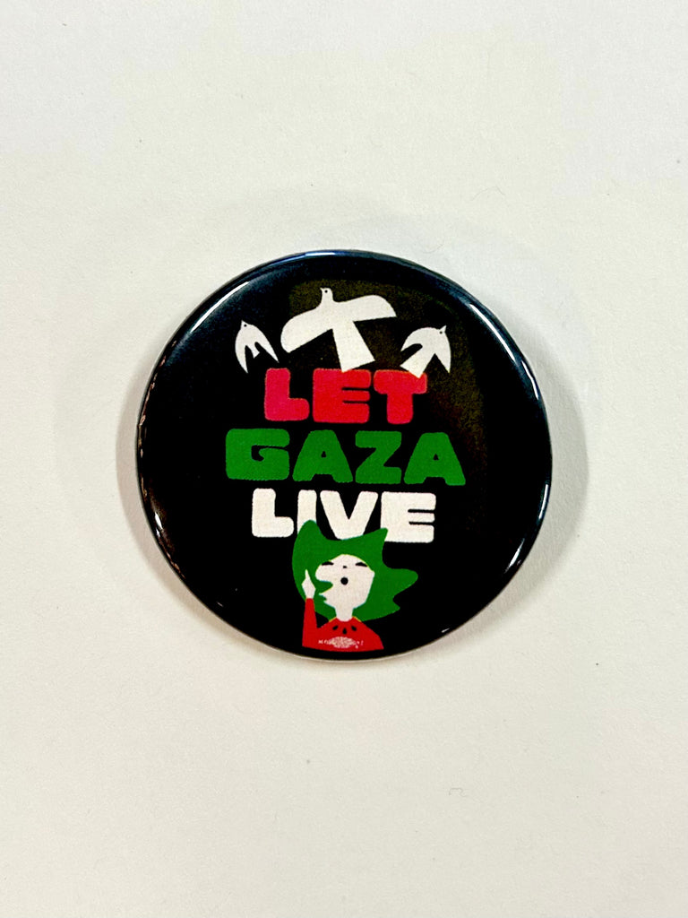 These buttons were designed to raise both funds & awareness for the ongoing crisis of forced starvation and violence against the Palestinian people by Israel.