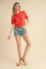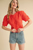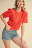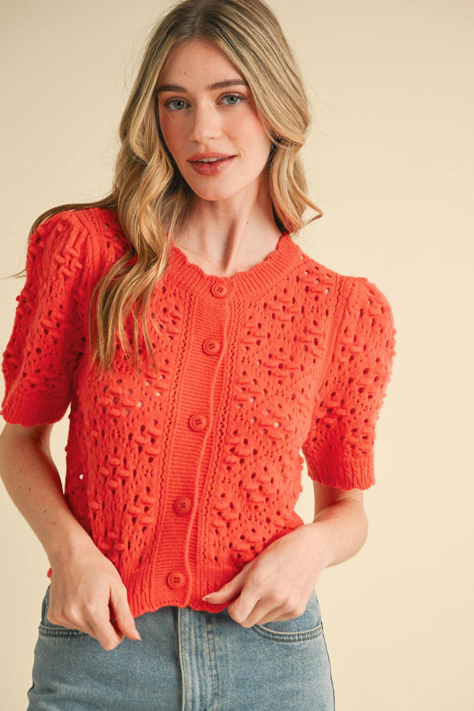 Cozy knit, with pierced pointelle throughout, shapes this darling sweater cardigan with a semi-cropped fit, button down placket, and short puff sleeves. Scalloped ribbed knit makes up the neckline, cuffs, and hem.