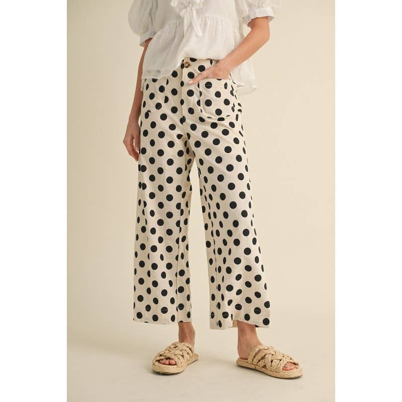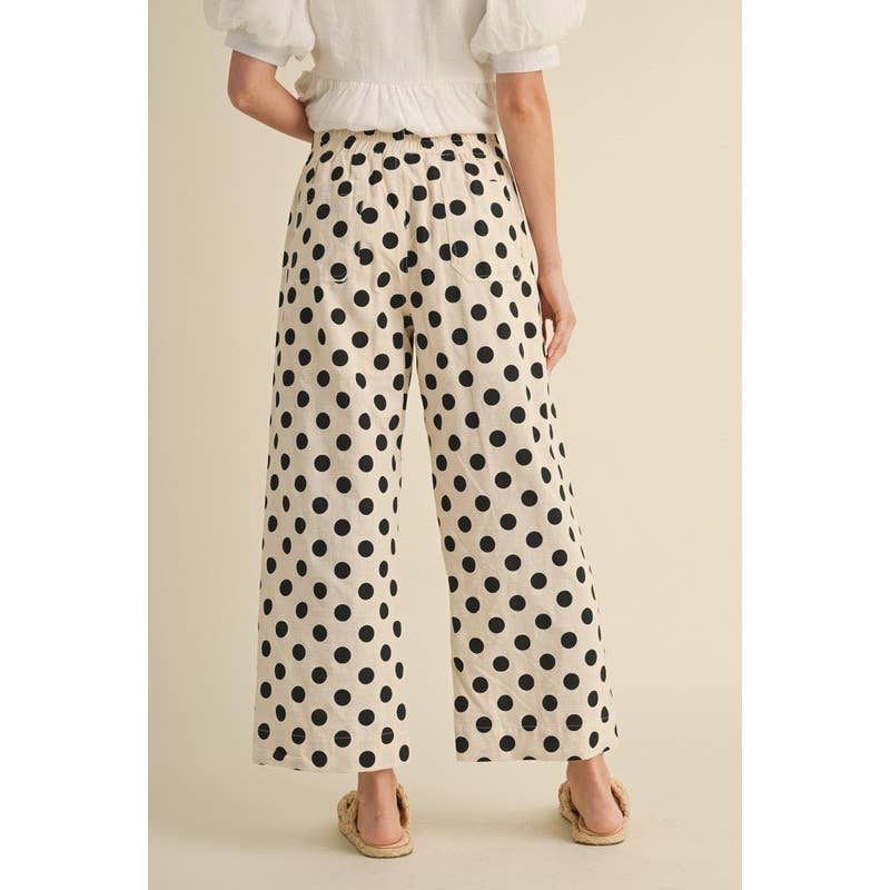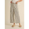 Polka dot print wide leg pants with hidden and zipper closure, back stretch band, side/back pockets.
