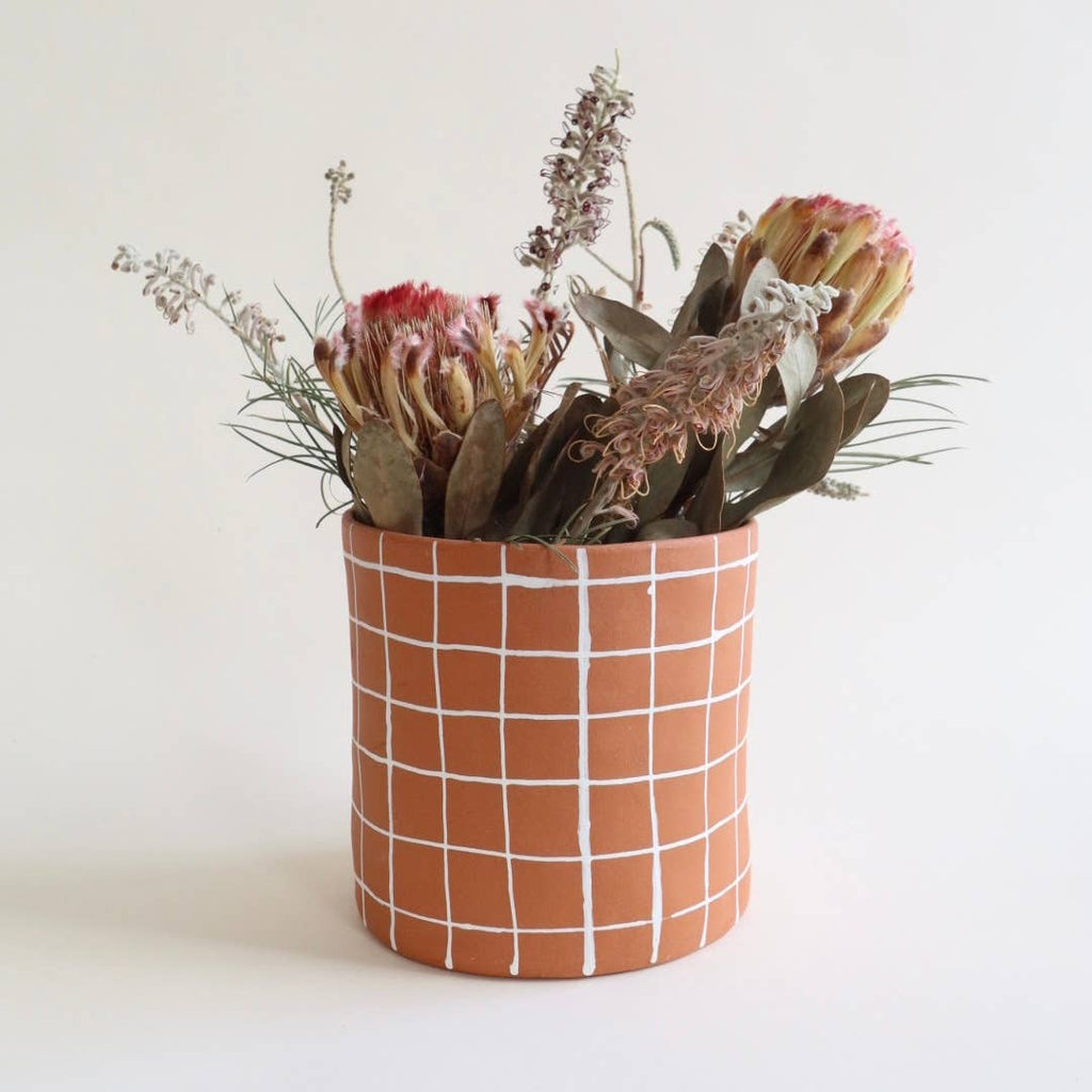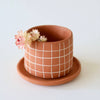 Handmade ceramic planter featuring a hand painted underglaze grid design.