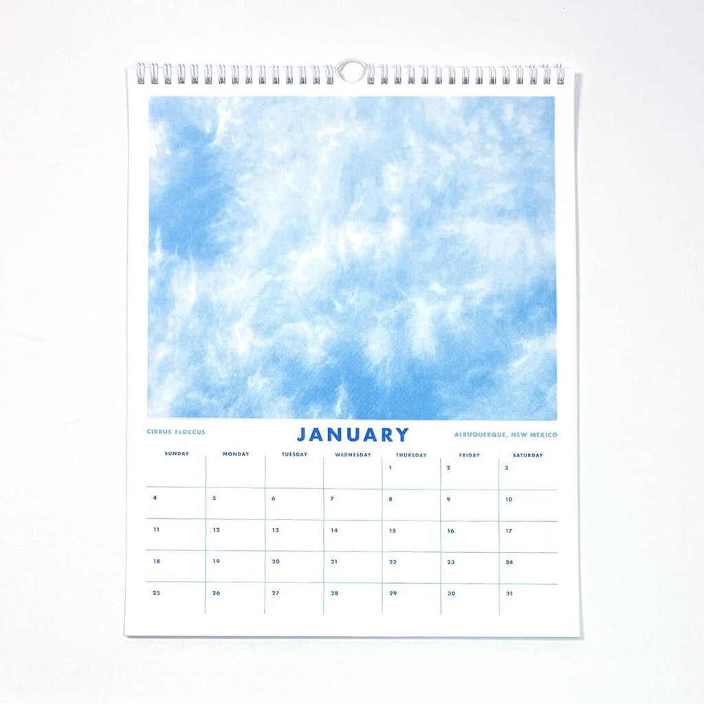 The Cloud Calendar features 12 photographs of clouds, each printed with Aqua and Blue inks. Location and type of cloud noted on each page.