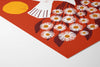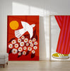 This print features a white dove in flight set against a warm red ground, with sun and floral elements woven throughout the composition.