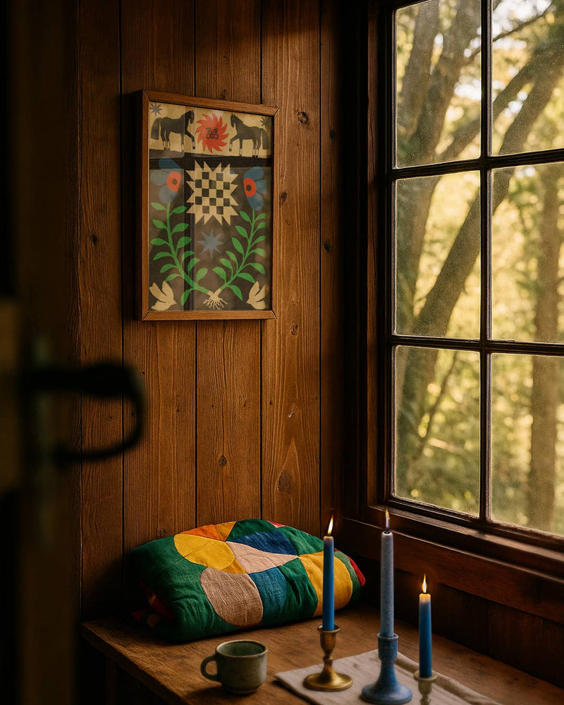 Together, they form a composition that grounds and protects, honors complexity, and calls the viewer back to what matters. Printed in saturated tones of red, cobalt, green, and ivory against a black field, this piece commands presence on any wall.