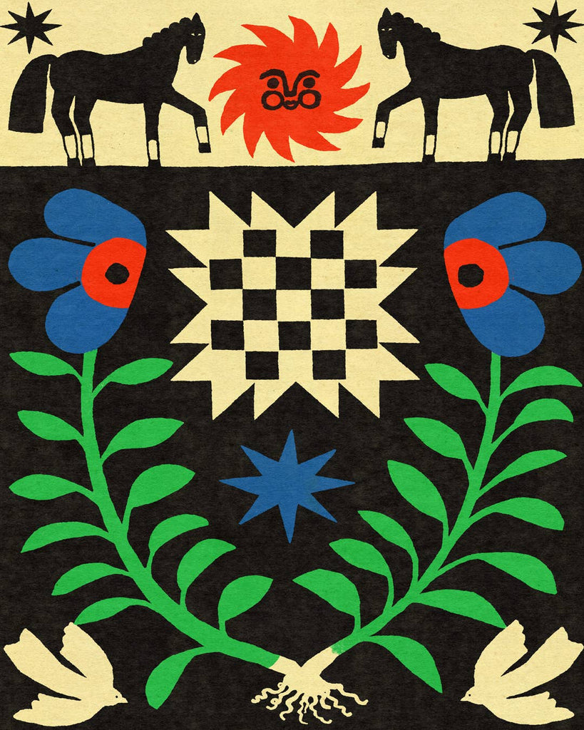 Two black horses stand sentinel beside a radiant red sun and twin stars, while below them, a checkerboard center bursts into symmetry — representing truth, clarity, and the tension between light and shadow. Surrounding the center, bright flowering vines twist upward from two connected roots, flanked by peace doves in motion. This is more than a print — it’s a visual incantation, crafted with intention. Each shape — from the eight-pointed star to the intertwined roots — carries weight.