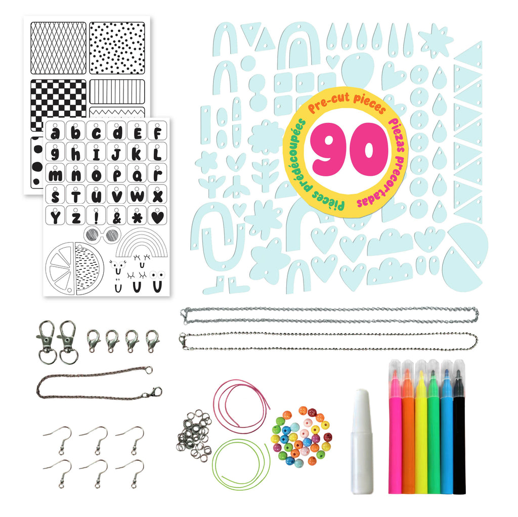 Make cool shrink jewelry with 80 precut pieces, markers, link chains, ball chains, key clips, and jewelry findings. Tracing templates allow you to make precut shapes into anything you like!