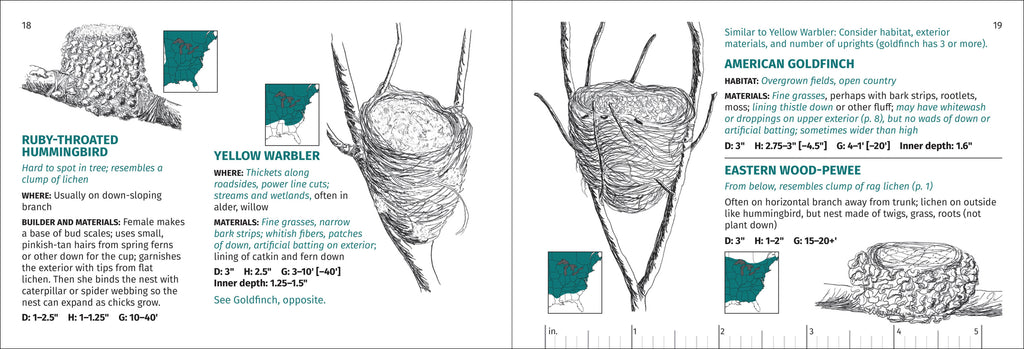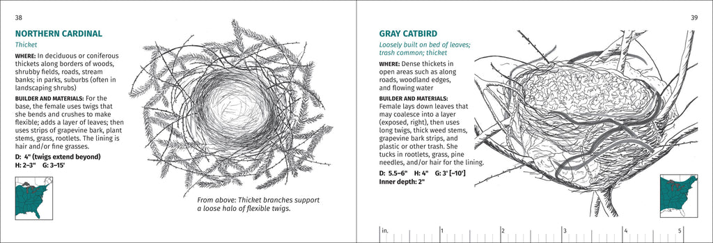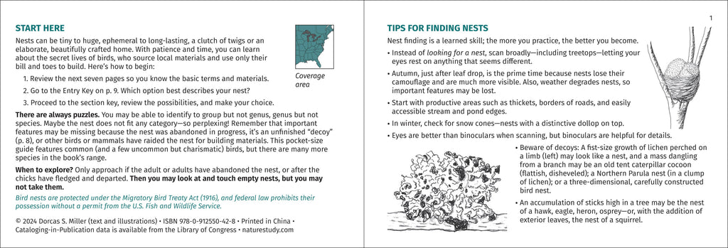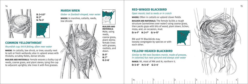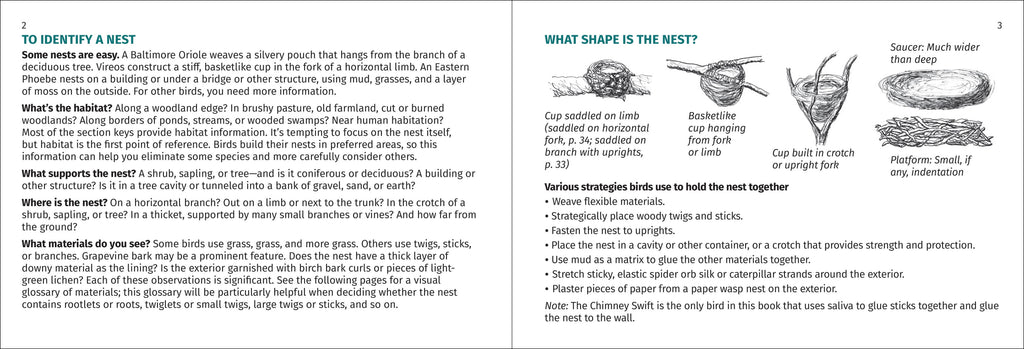Identify aboveground nests in eastern North America with this pocket-size guide. With the handy, easy-to-use format, you can identify commonly seen bird nests—from bluebirds and cardinals to hummingbirds and orioles. The booklet provides a dichotomous key to identifying aboveground bird nests. Simply answer a series of simple questions about the type, size, and location of the nest, as well as the materials from which it’s made. Along the way, professional illustrations help to guide you to a positive identification. This guide is applicable to eastern Canada and the US states of Alabama, Arkansas, Connecticut, Delaware, Florida, Georgia, Illinois, Indiana, Iowa, Kentucky, Louisiana, Maine, Maryland, Massachusetts, Michigan, Minnesota, Mississippi, Missouri, New Hampshire, New Jersey, New York, North Carolina, Ohio, Pennsylvania, Rhode Island, South Carolina, Tennessee, Vermont, Virginia, West Virginia, Wisconsin, and parts of Kansas, Nebraska, Oklahoma, and Texas. [64 pages]