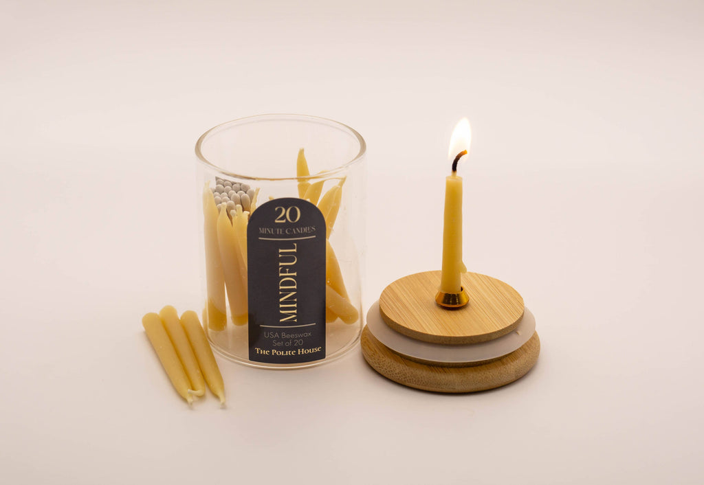 Includes 20 hand-dipped USA Beeswax candles that each burn for 20 minutes. Comes with a display jar, 20 candles, 20 matches, strike-pad, and candle holder inside lid.
