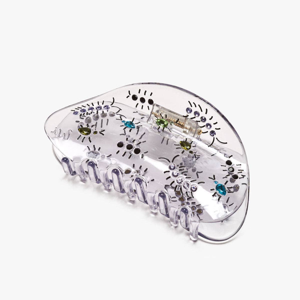 Clear acetate claw with green, black, teal, and tanzanite color stones and hand-painted details.