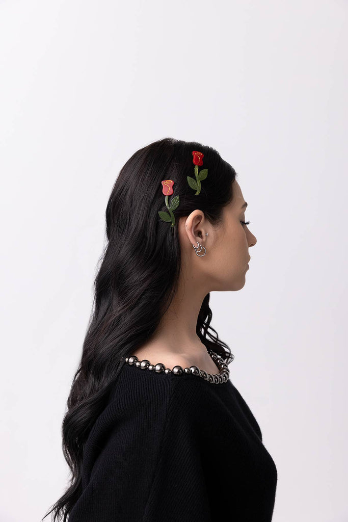 Equal parts fun and elegant, this pair of rose barrettes lends a special touch to any look. To keep your roses fresh as long as possible, we advise handling them gently by the leaves and avoiding putting pressure on the ends of the clip.