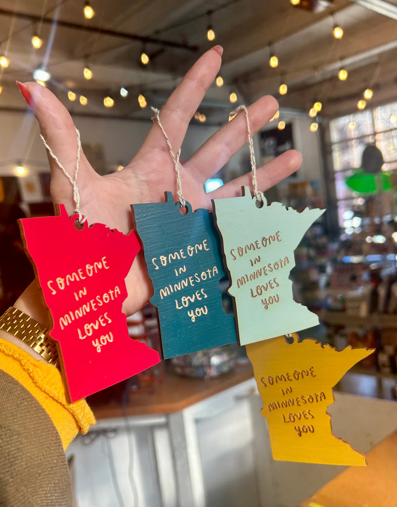 Spread the Minnesota love far and wide with a handcrafted large ornament! Laser cut wooden large ornament in the shape of Minnesota engraved with the words 'Someone in Minnesota Loves You' in our signature handwritten font.