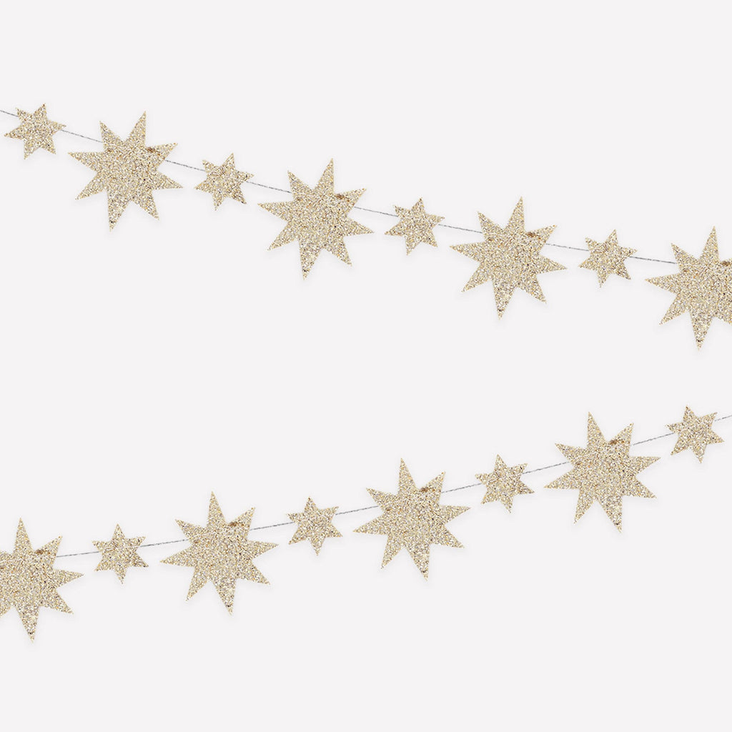 Let the spirit of Christmas shine bright with this sparkly star garland. Made with chunky gold glitter stars, in alternating sizes, it's the perfect way to add festive magic to your window, porch, doorway or mantel. Reusable, simply pack it away after the celebrations are over, and bring it out year after year for an instant show-stopping look.