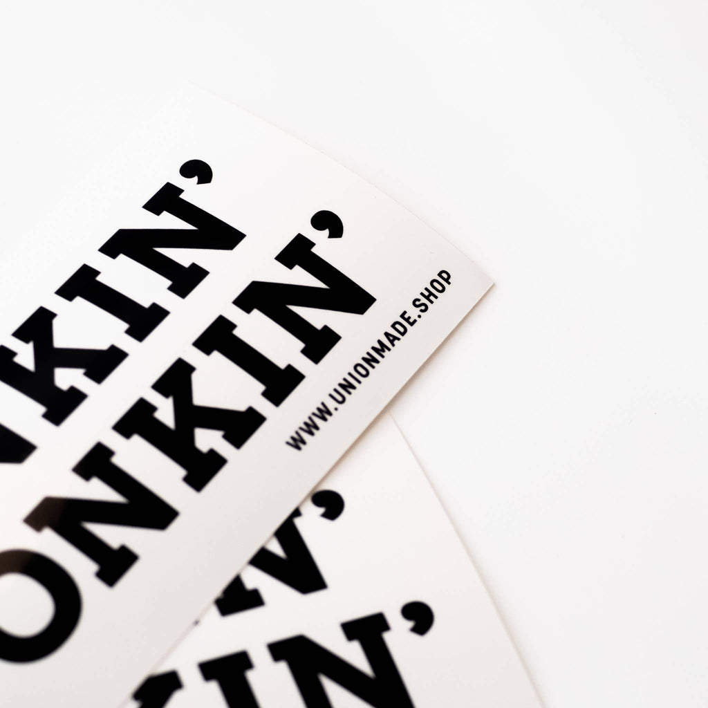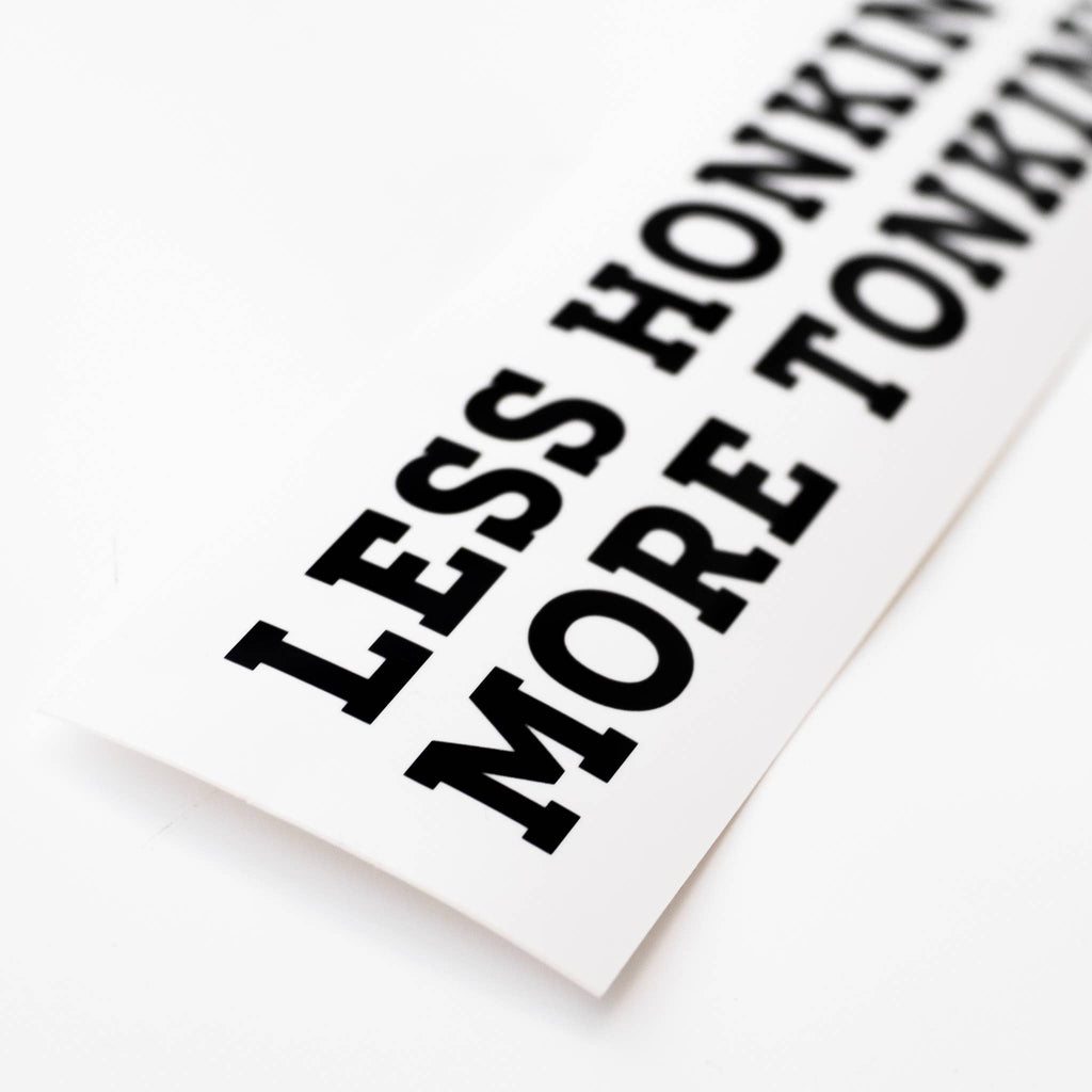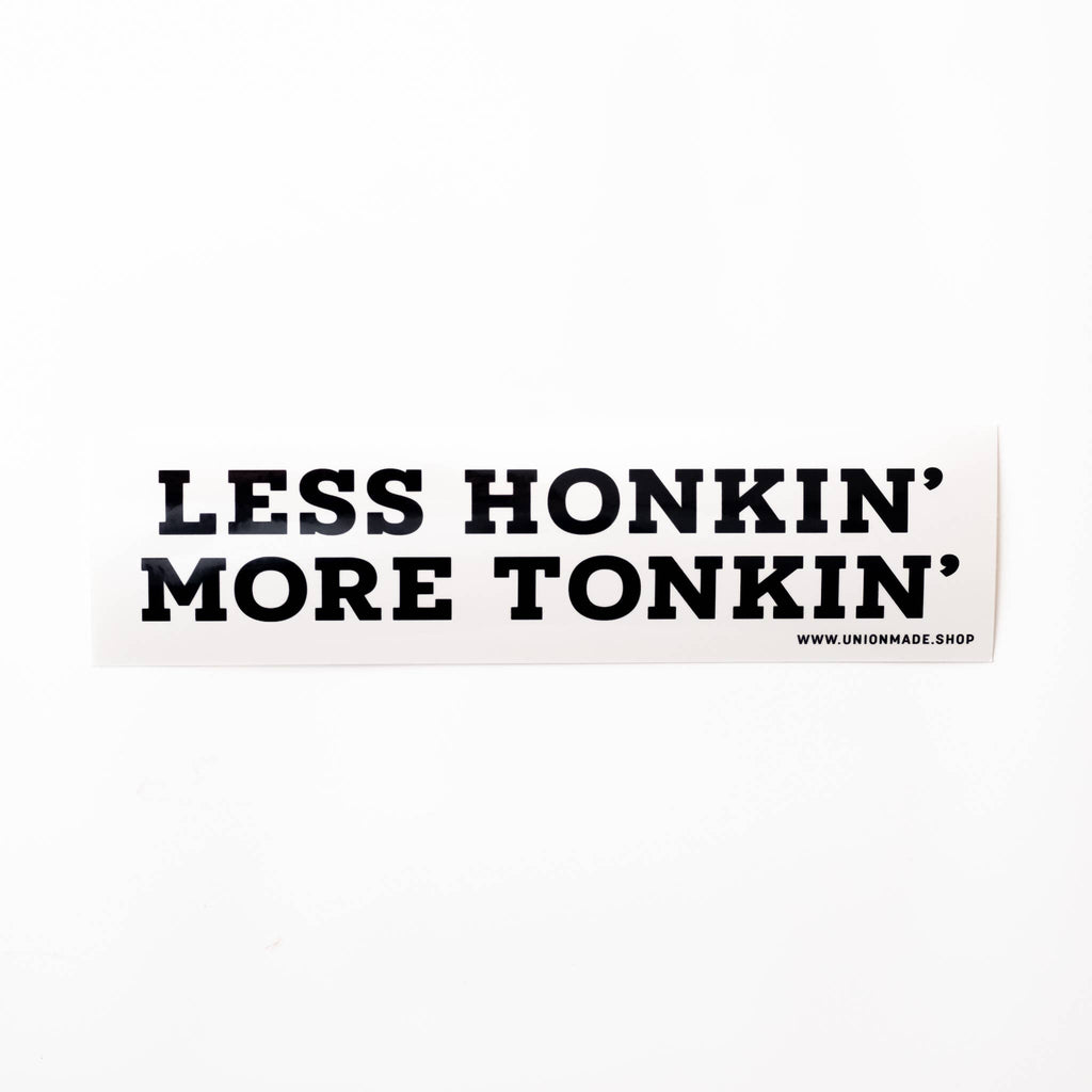 Our 9x3 inch vinyl bumper sticker, featuring the phrase "Less Honkin" More Tonkin' " is a unique, hand-designed piece that blends style and durability.