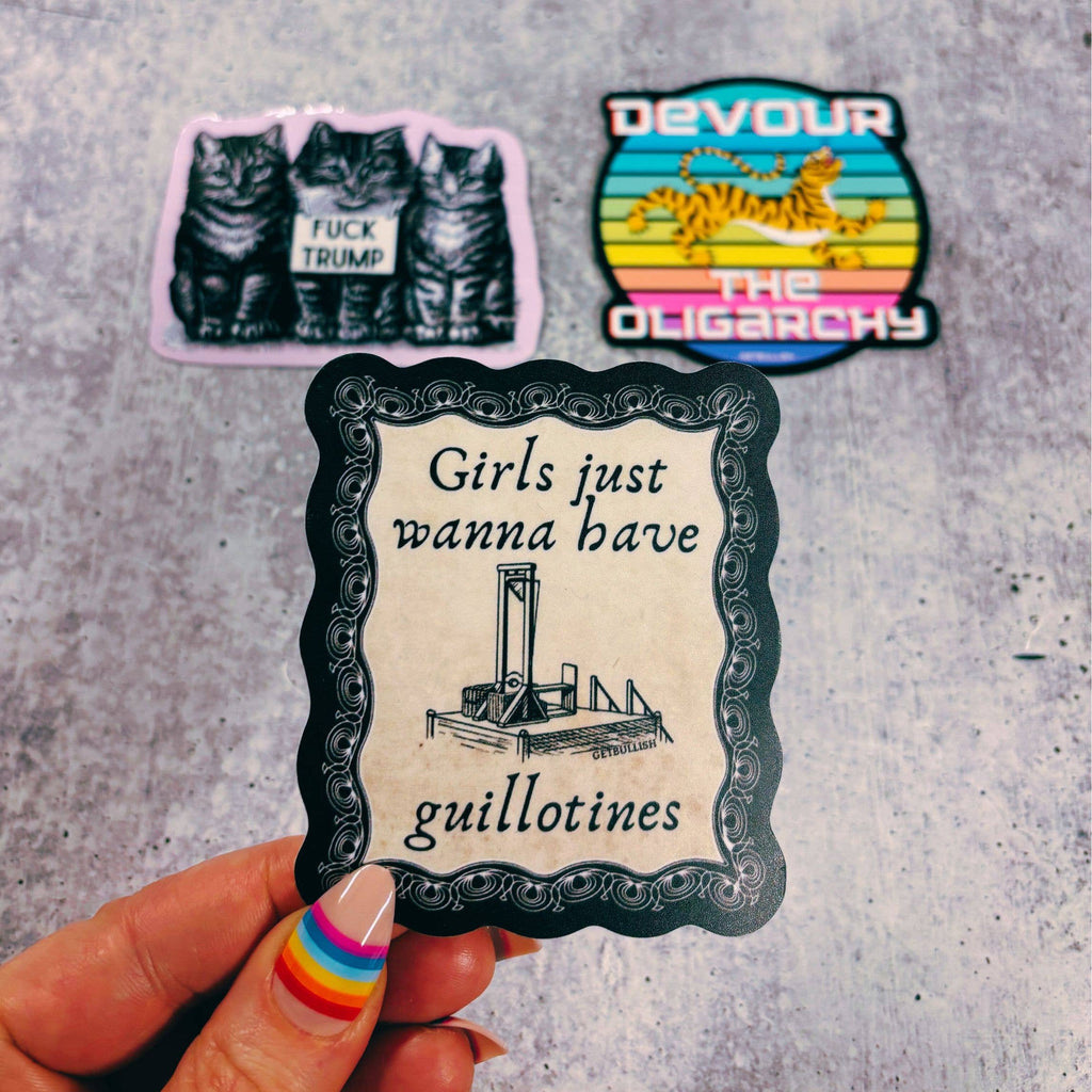 Reads: "Girls Just Wanna Have Guillotines"