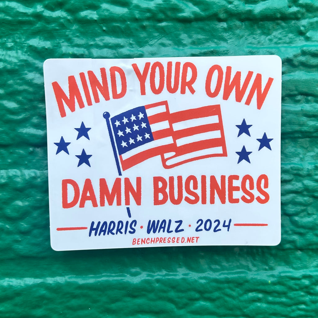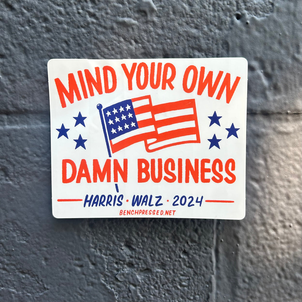 Mind Your Own Damn Business sticker 4.25x3.5 inches.