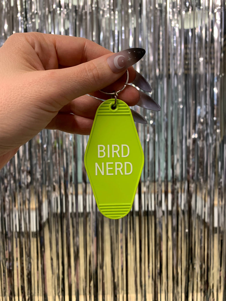 Keychain reads "BIRD NERD" in classic motel style design on vibrant lime green.