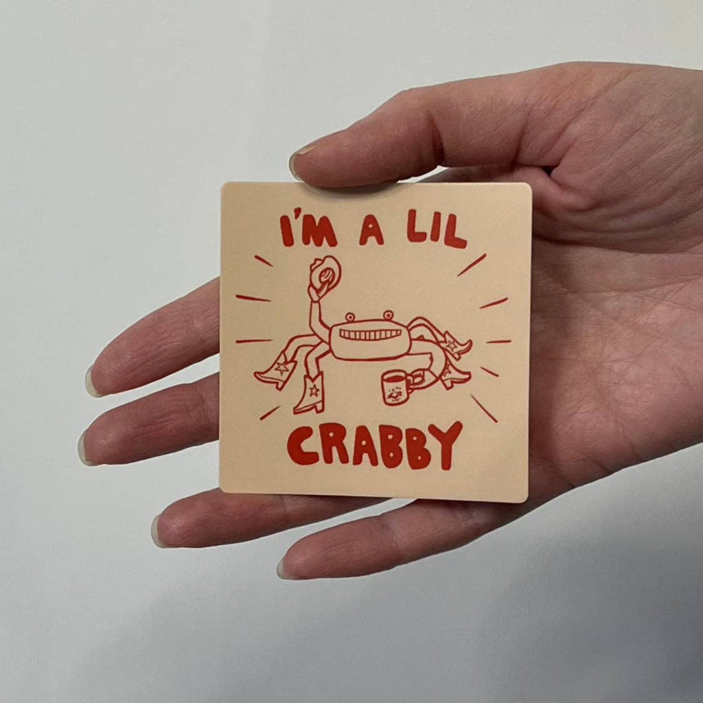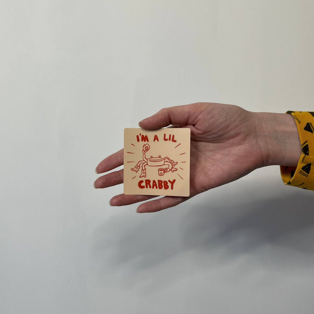 I'm a lil' crabby, how about you? * Waterproof, UV protected sticker * Matte finish * Dimensions: 2.75" square * Printed in the USA * Original illustration by Ramona Muse Lambert