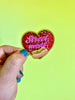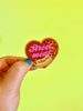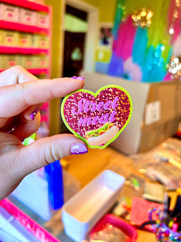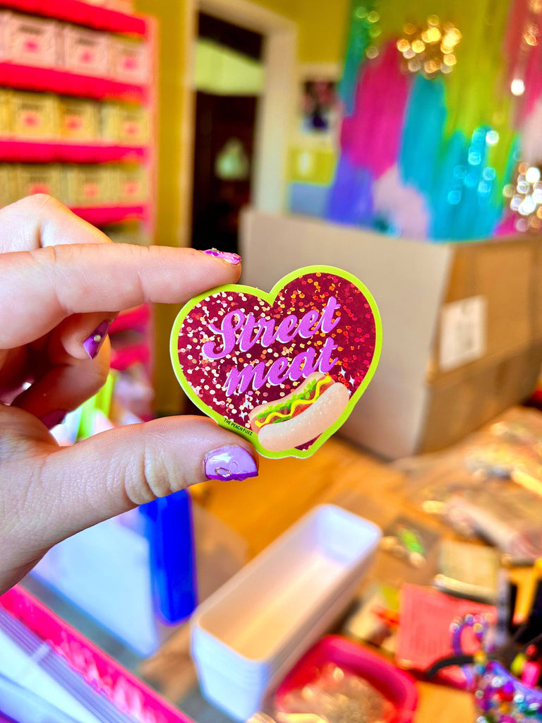 The most holy and divine meal: street meat. Piled high with all of the fixings, show your love for the reason these city streets occasionally smell good with this sparkly heart-shaped sticker.