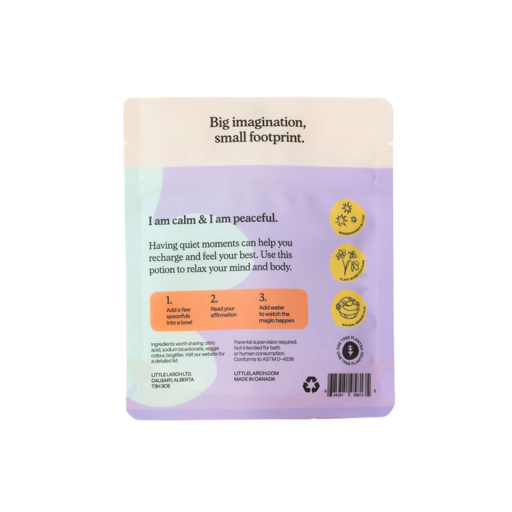 Our Calm Potion has been designed to help kids recharge through quiet moments of reflection. Simply add a few spoonfuls of Potion Play to a bowl or bucket, add water and watch as your potion bubbles and brews.