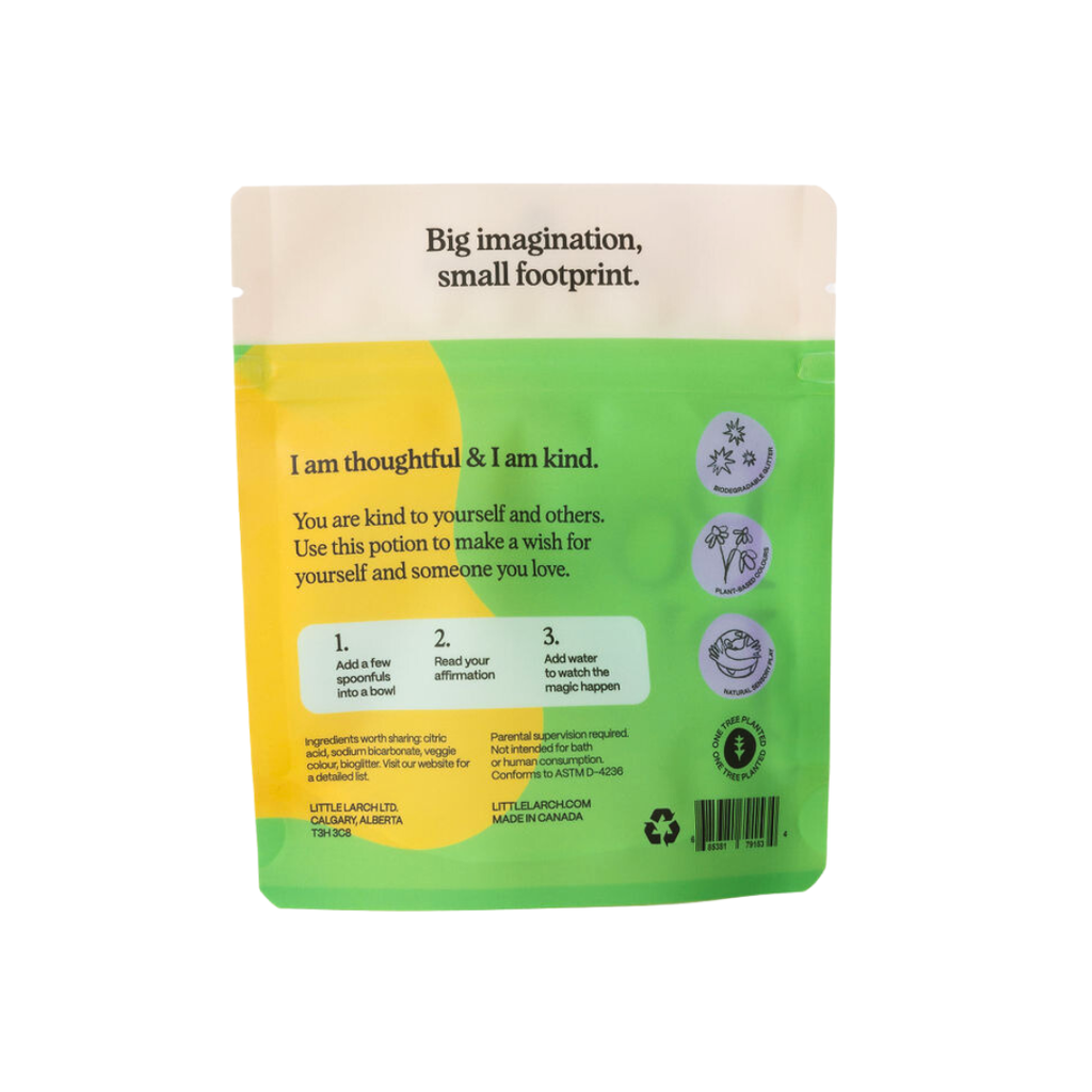 Our Potion Play has been designed to spark mindful, creative sensory playtime. Crafted in Canada with wholesome ingredients, like veggie dyes and biodegradable glitter, for planet-friendly fun.