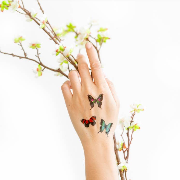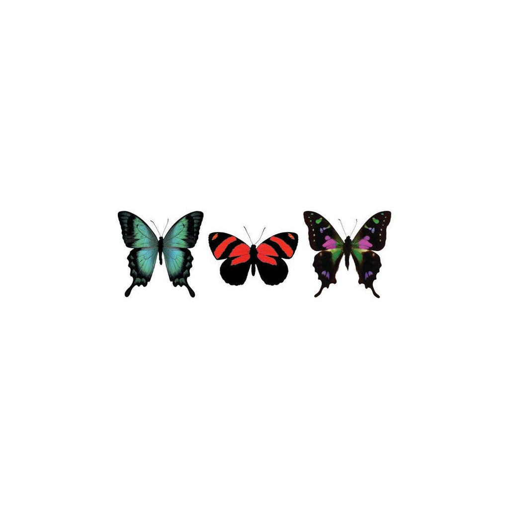 Butterfly Trio Tattoo Pair by artist Barloga Studios. Safety tested, vegan, cruelty free, and made in the US with domestic and imported materials. Tattly Pairs include two of each design packaged in a polybag and sealed with a branded topper that's ready to hang.
