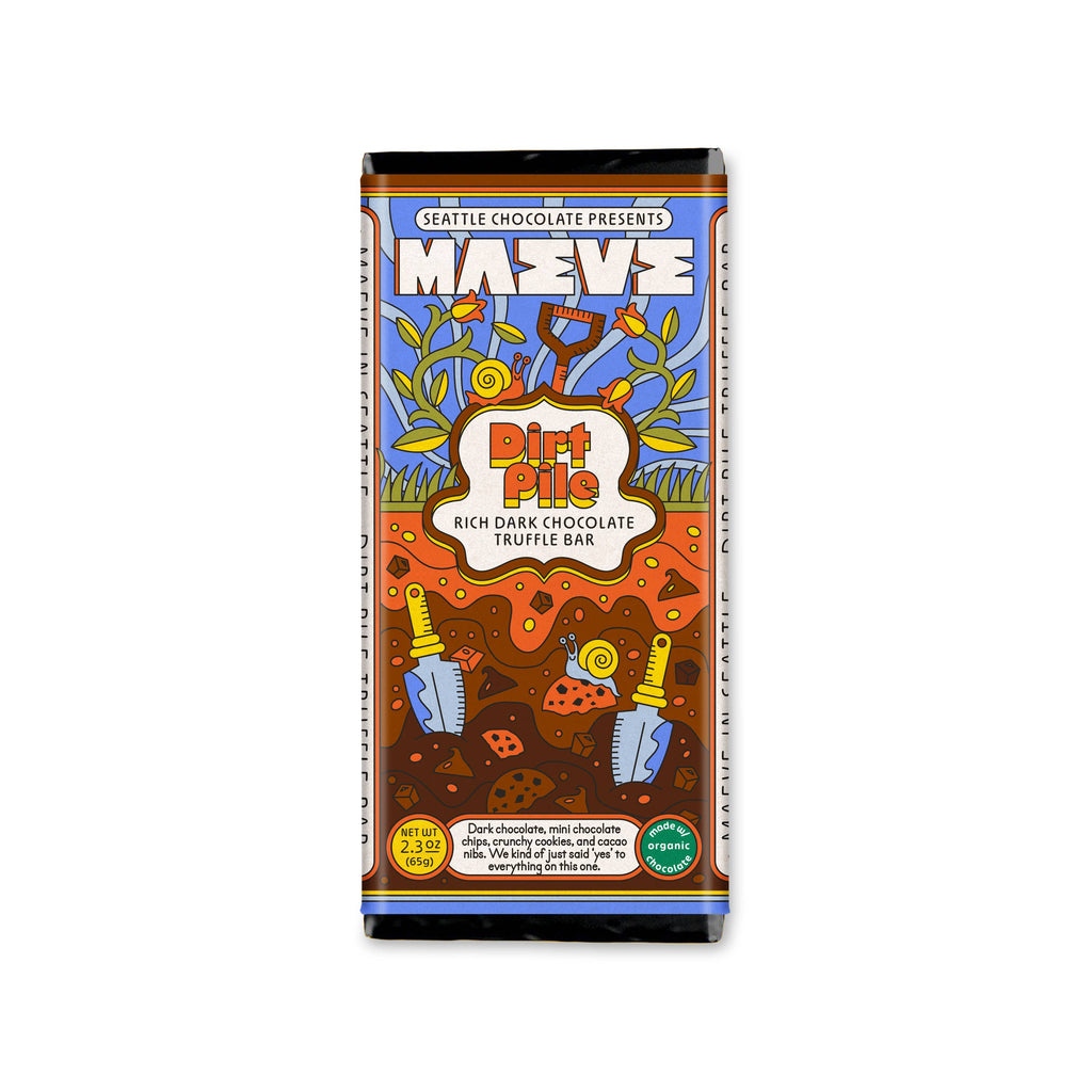 Dark chocolate packed with mini chips, crunchy cookies, and cacao nibs for a playfully delicious dirt-inspired bite. Made with organic chocolate.