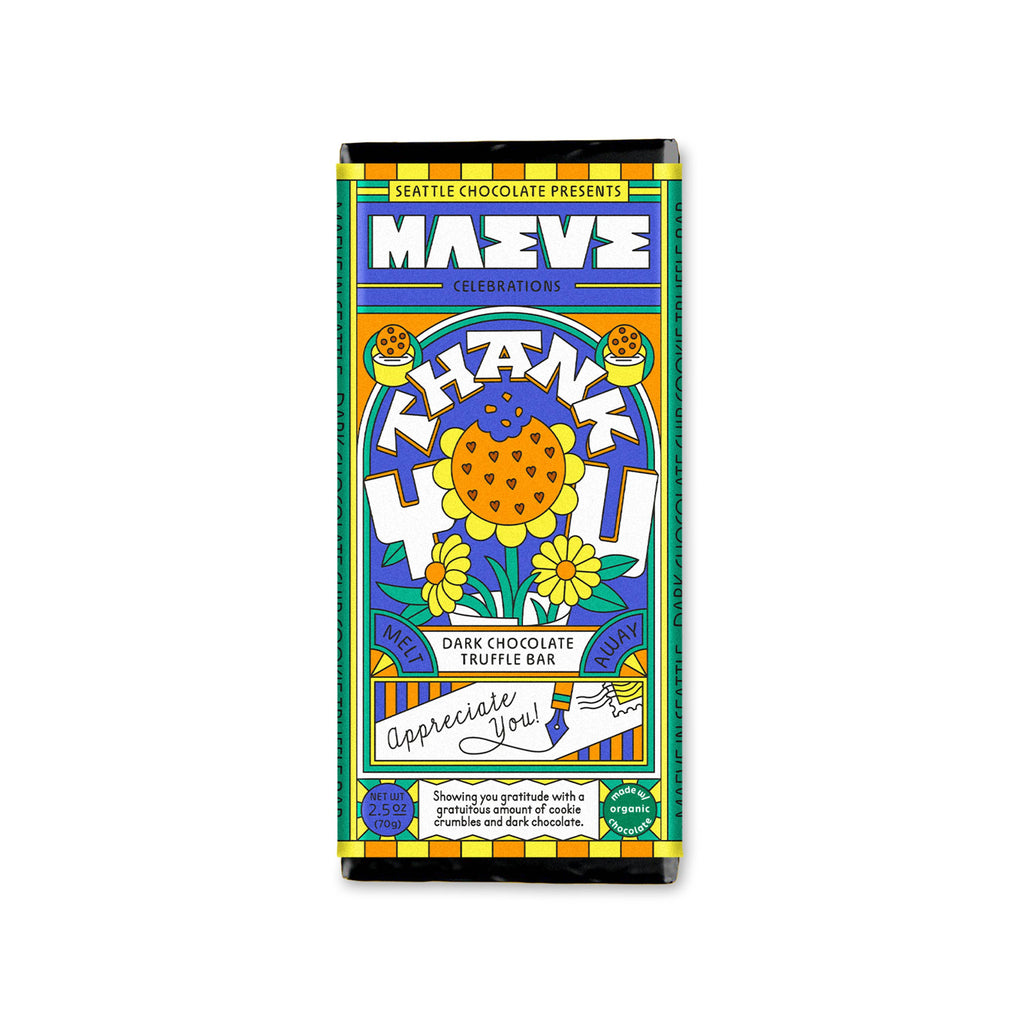 There are lots of ways to show appreciation, but if you ask us, nothing says ‘thank you’ like cookies and chocolate. What can we say, sweet treats are our love language. Maeve’s Thank You truffle bar is decadent dark meltaway chocolate brimming with gratitude AND packed with mini, crunchy chocolate chip cookie pieces. Made with organic chocolate. (2.5oz) Explore more fun flavors that celebrate life's big & small moments: Happy Birthday and Sip Sip Hooray When you pick Maeve, you’re choosing a sustainably sourced, eco-conscious, woman-owned brand — and you’re also choosing FUN. • Woman-owned and led • 10% net profits donated to cocoa farmers • Ethically sourced, non-GMO chocolate • Carbon neutral