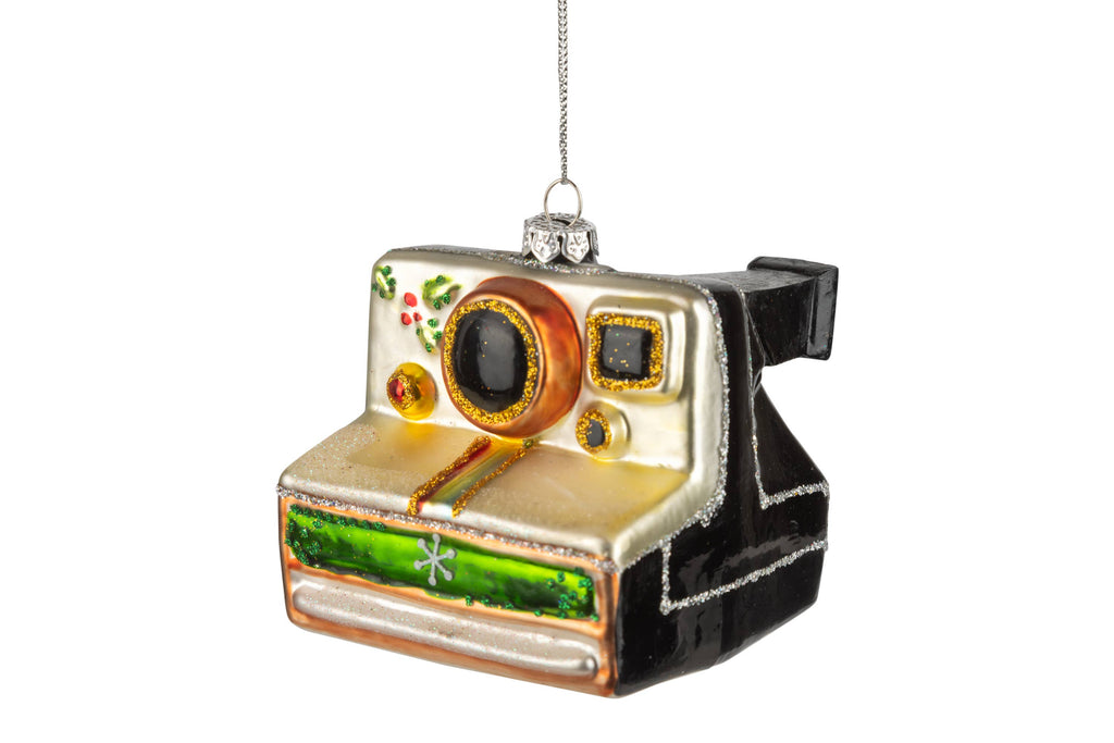 Glass polaroid camera ornament, grey and white, 3.25 in.