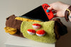 Crafted with chocolate brown corduroy bark, soft chartreuse sherpa moss, mustard yellow canvas, printed wood-patterned canvas liner, and super soft and squishy mochi minky fabric mushrooms.