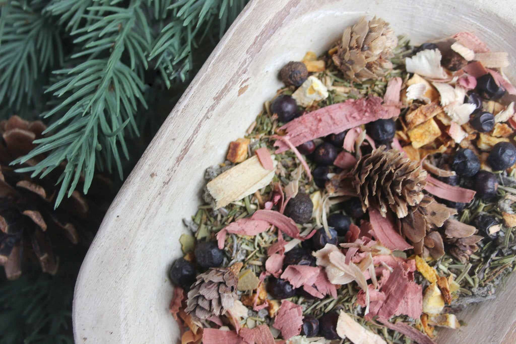 Each small-batch blend features evergreen pine needles, dried pinecones, juniper berries, cedarwood chips, eucalyptus leaves, orange peels, sage, thyme, and rosemary — a fragrant mix that evokes the scent of freshly cut trees and cozy cabin retreats.