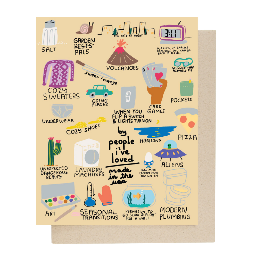 A celebration of all the good little things that carry us through. From haircuts to hot tea, from socks to aliens — this card is a reminder that magic is hiding everywhere. 3.5 x 5 inches Digitally printed greeting card on archival-quality card stock with a kraft envelope.