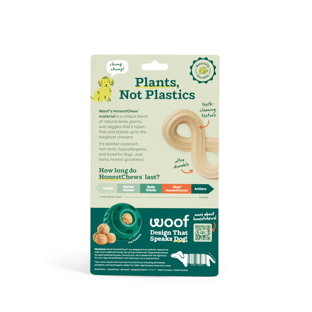 Calling all power chewers! Woof’s ultra-durable chewbone is powered by plants, not plastic. Lots of dog chews claim they’re natural — but look closer and you’ll find plastic, petroleum, and mystery flavors. HonestChew lives up to its name. Made with food-grade, plant-based ingredients like cellulose (a naturally tough fiber that gives plants their structure) and real antler for a satisfying chew time and gnaw-worthy flavor. Splinter-resistant and hypoallergenic, it’s a safer, more durable alternative to rawhide and traditional bones (healthier for teeth, too!). Got a dog with an appetite for destruction? HonestChew’s for you. Choose from Antler or Infinity Bone. Size Guide: Small: Under 25lbs Medium: 25-60 lbs Large: 60+ lbs