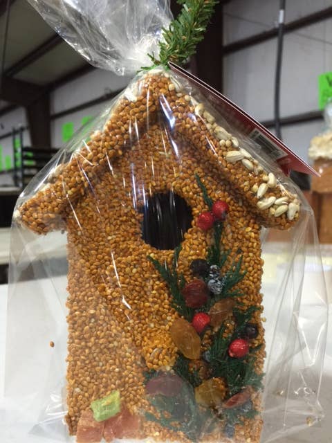 These three adorable cottages make a sweet seed treat! Hand decorated with millet, black oil sunflower, juniper, cranberries, and raisins. Under the seed and decoration is a small ornamental wooden birdhouse.