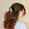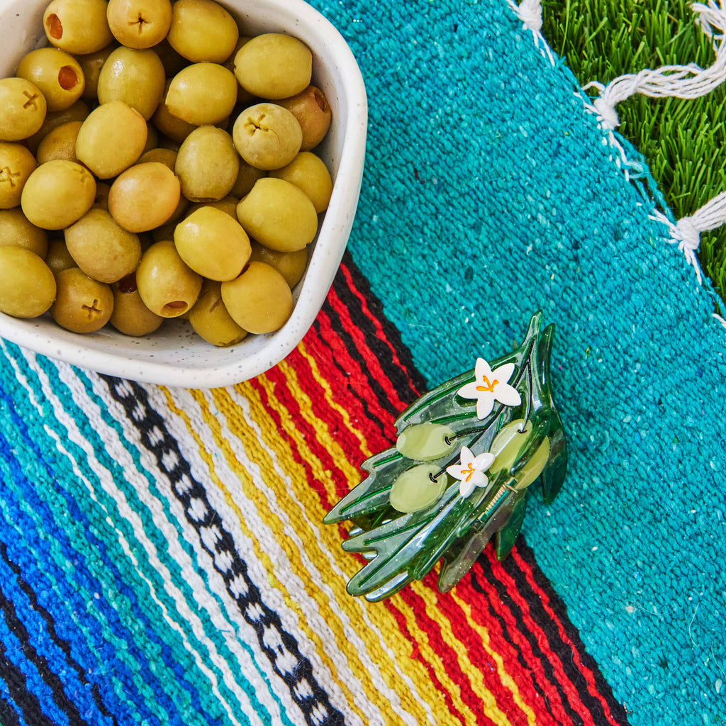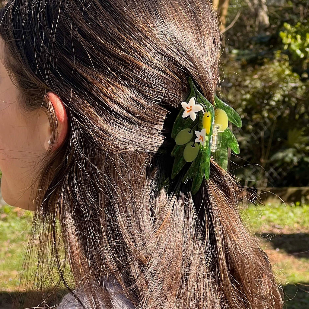 Featuring delicate olive blossoms and leafy details, this 4" x 2" plant-inspired claw is made from eco-friendly cellulose acetate. A sustainable hair accessory perfect for nature lovers, garden party looks, and Mediterranean vibes. This olive branch hair claw adds a fresh twist to any hairstyle.