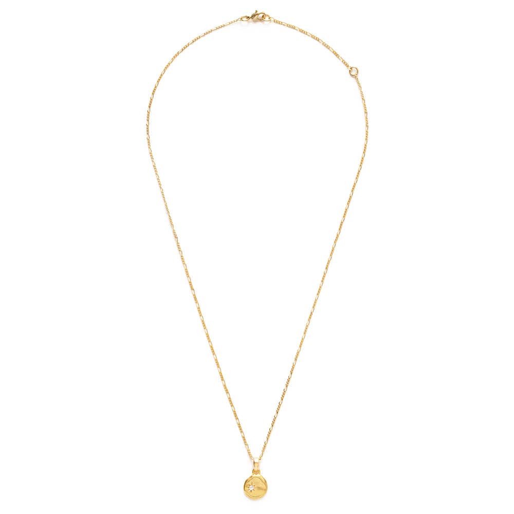 This single star on the hand carved pendant is set with a Czech crystal. It is made of gold plated brass. The chain is 20" long with a ring at 18" so it can be adjusted to various lengths.