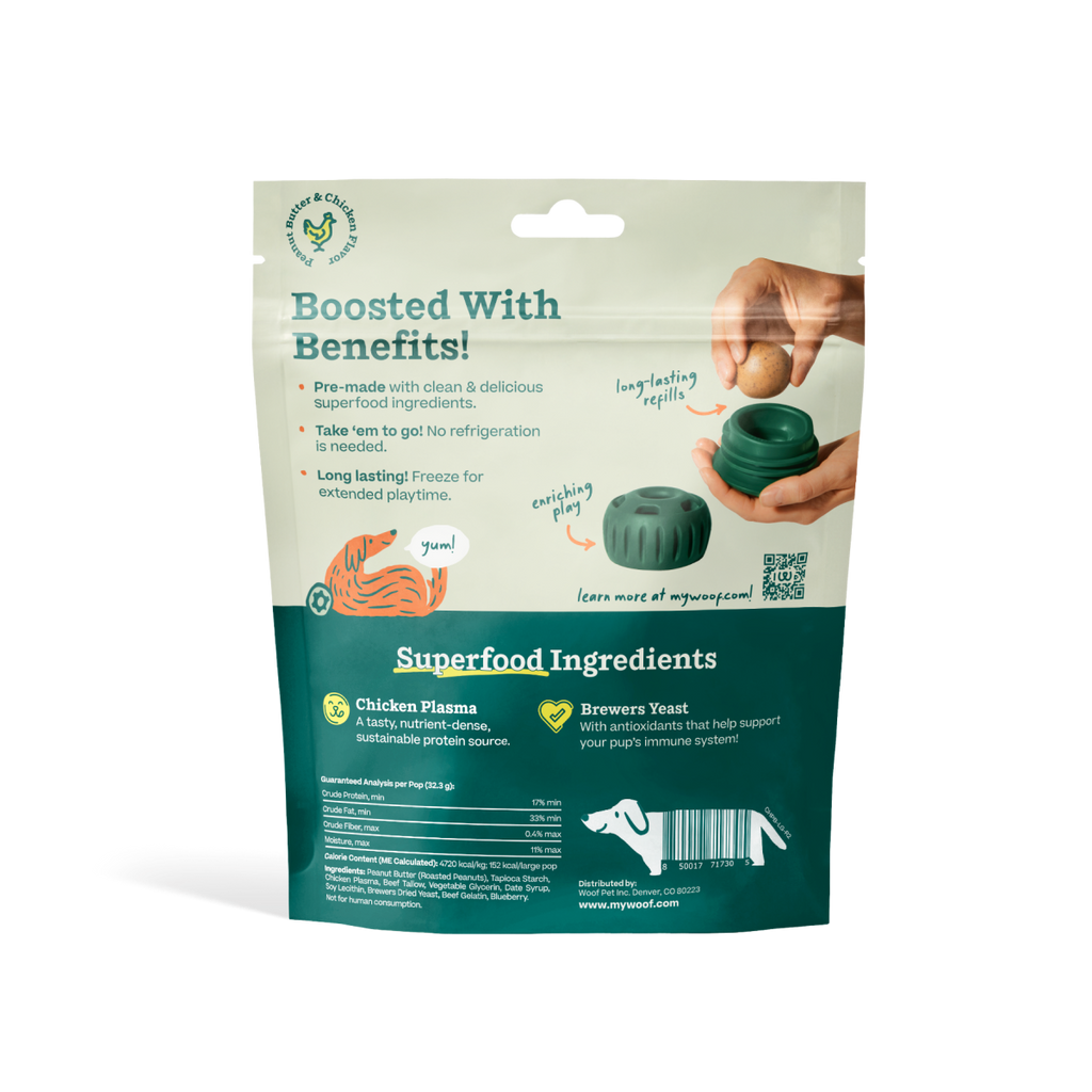 Our longest-lasting treats for The Pupsicle, our pre-made Pupsicle Pops provide 20-40 minutes of entertainment, enrichment and peace for you and your pup.  Made in small batches in the USA with all-natural ingredients pups of all shapes, sizes and ages love our Pops. They're long-lasting, mess-free, and conveniently shelf stable (no refrigeration needed) - so take them anywhere!