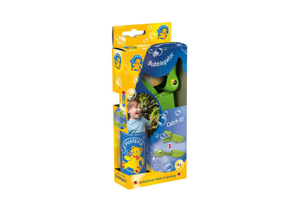 Children love to catch and burst flying Pustefix bubbles. The Bubblegator simply devours them with the touch of a button. Watch it's head pop out as it snatches bubbles from the air. Includes a 70 ml/2.3 oz Classic Tube of Pustefix liquid. Made in Germany.