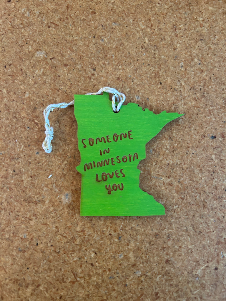 Spread the Minnesota love far and wide with a handcrafted ornament! Laser-cut wooden ornament in the shape of Minnesota engraved with the words 'Someone in Minnesota Loves You' in our signature handwritten font.