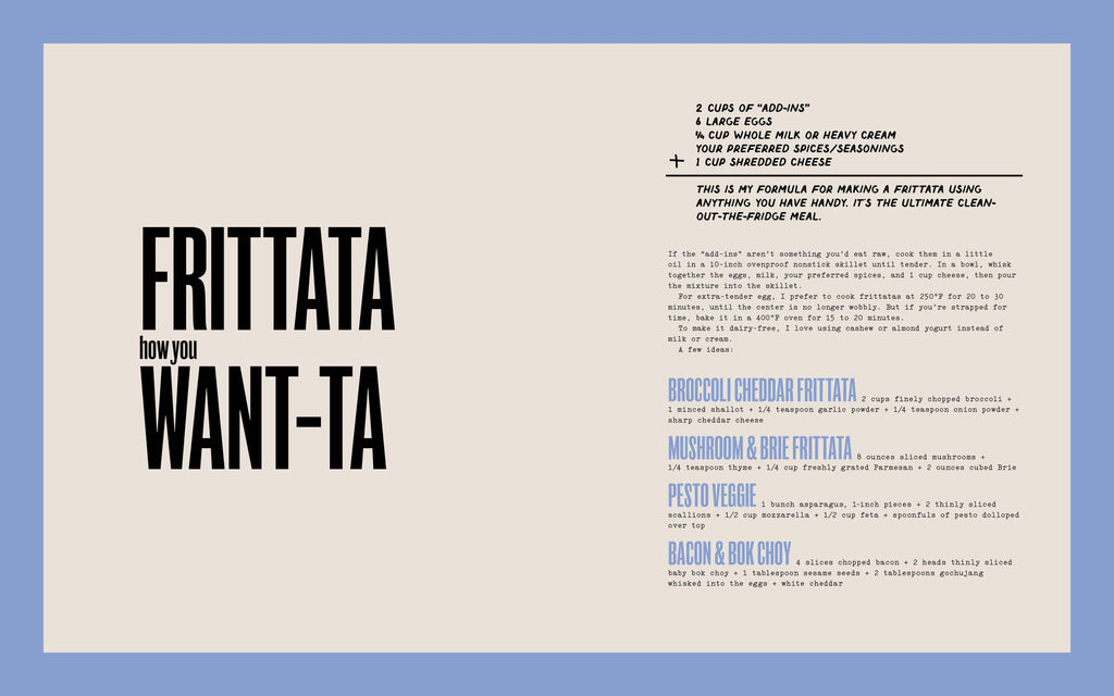 The recipes are organized by the amount of time they take to cook, so whether you have 15 minutes to throw together something or a little bit more time on your hands, dinnertime is totally doable. On top of that, Caro gives you more ways to choose, so you can search by protein. Most importantly, these recipes include Caro's famously extensive swaps, riffs, tips, shortcuts, and more to be sure they work best for you, helping you save money, improvise, and even learn a thing or two.